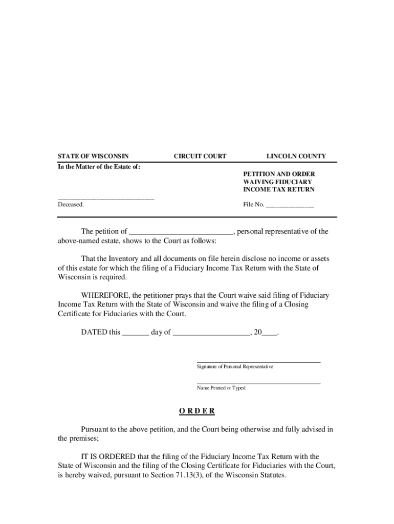 STATE OF WISCONSINCIRCUIT COURTLINCOLN COUNTY In the Matter of the Estate of: PETITION AND ORDER WAIVING FIDUCIARY INCOME TAX RETURN ___ Deceased. File No. ___The petition of ___, personal representative