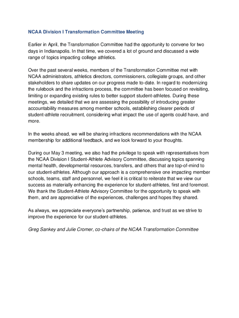 NCAA Division I Transformation Committee Meeting Earlier in April, the Transformation Committee had the opportunity to convene for two days in Indianapolis. In that time, we covered a lot of ground