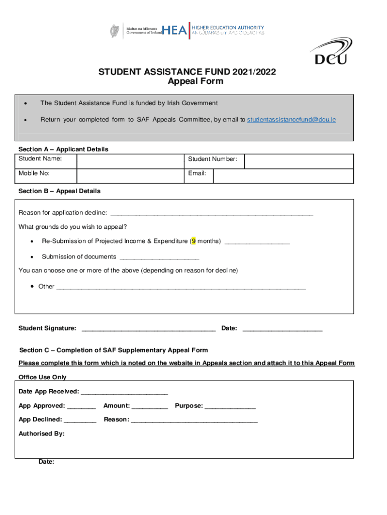 STUDENT ASSISTANCE FUND 2021/2022 Appeal Form The Student Assistance Fund is funded by Irish GovernmentReturn your completed form to SAF Appeals Committee, by email to studentassistancefund@dcu.ieSection