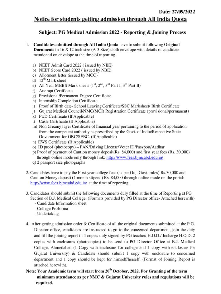 Date: 27/09/2022Notice for students getting admission through All India Quota Subject: PG Medical Admission 2022 Reporting & Joining Process 1. Candidates admitted through All India Quota have to