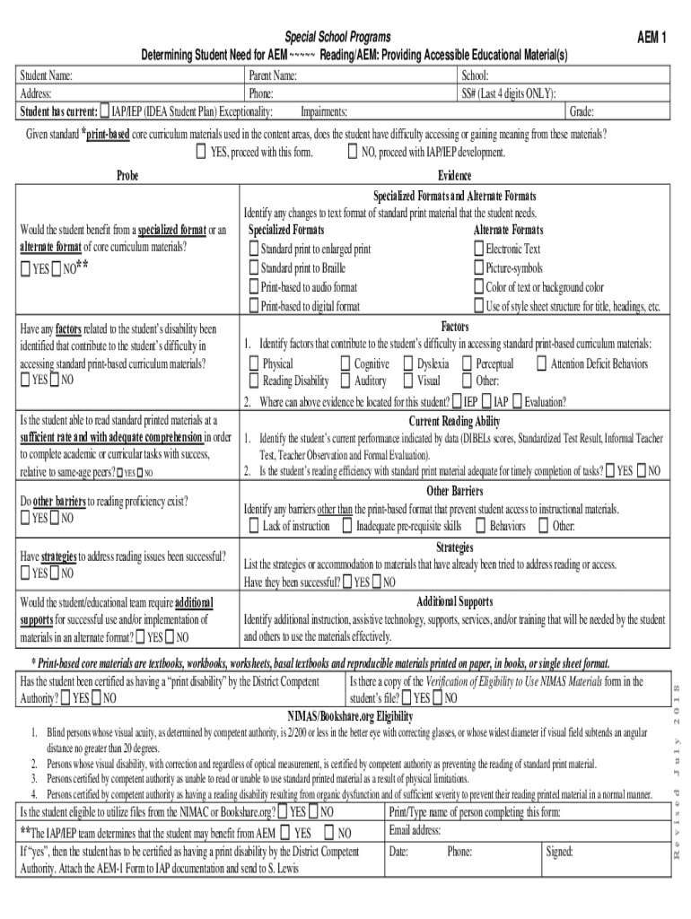 Student Name: Address: Student has current:Special School Programs Determining Student Need for AEM Reading/AEM: Providing Accessible Educational Material(s) Parent Name: School: Phone: SS# (Last