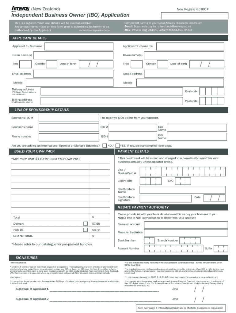 (New Zealand)New Registered IBO#Independent Business Owner (IBO) Application Completed Forms to your local Amway Business Center or: Email: Scanned copy to nzfeedback@amway.co.nz Mail: Private Bag