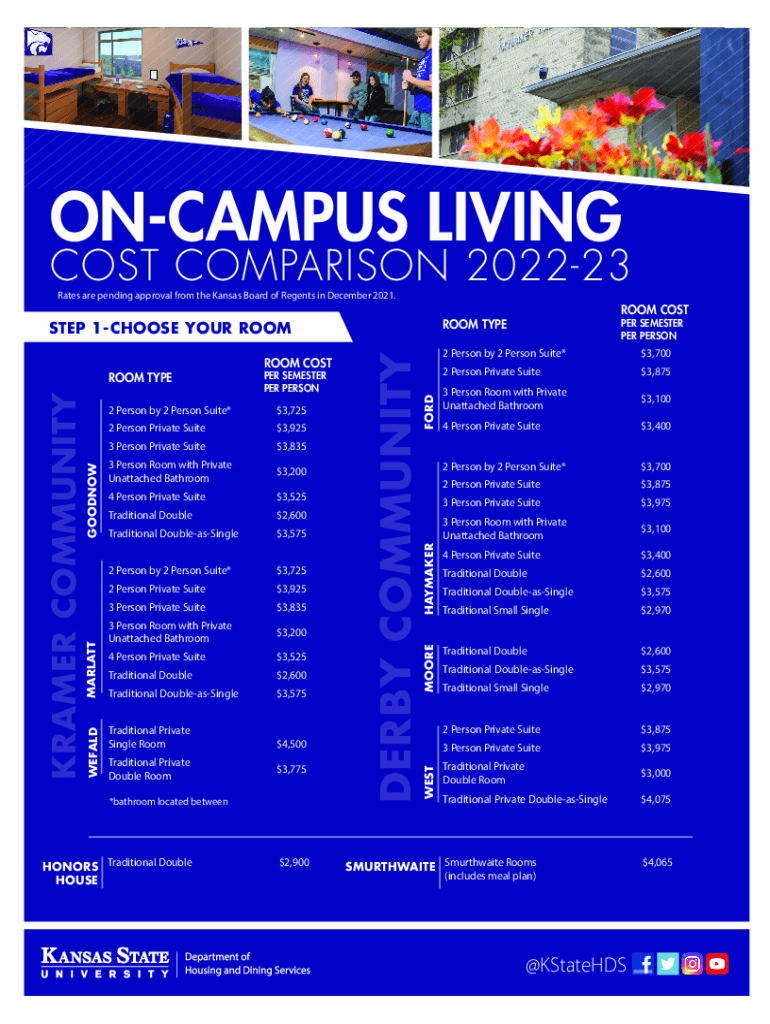 CAMPUS LIVINGS COMPARISON 202223 Rates are pending approval from the Kansas Board of Regents in December 2021.2 Person Private Suite$3,9253 Person Private Suite$3,8353 Person Room with Private Unattached