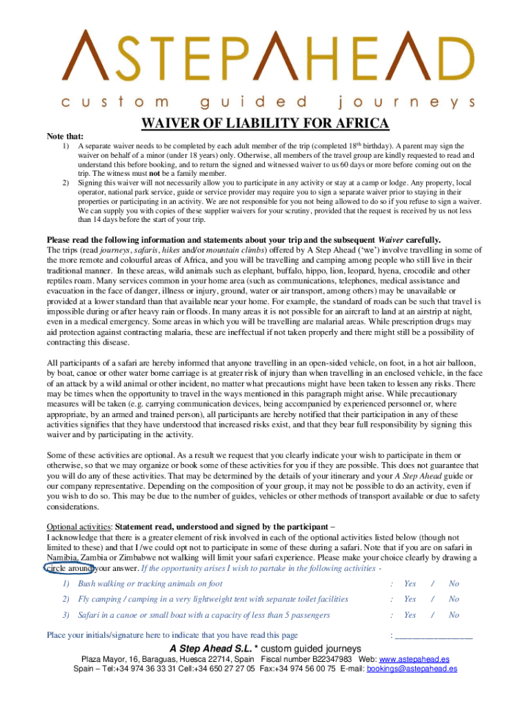 WAIVER OF LIABILITY FOR AFRICA Note that: 1)2)A separate waiver needs to be completed by each adult member of the trip (completed 18th birthday). A parent may sign the waiver on behalf of a minor