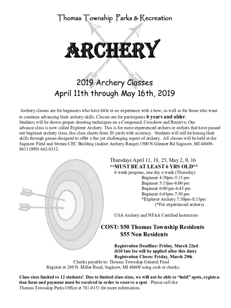 Thomas Township Parks & RecreationARCHERY 2019 Archery Classes April 11th through May 16th, 2019 Archery classes are for beginners who have little or no experience with a bow, as well as for those