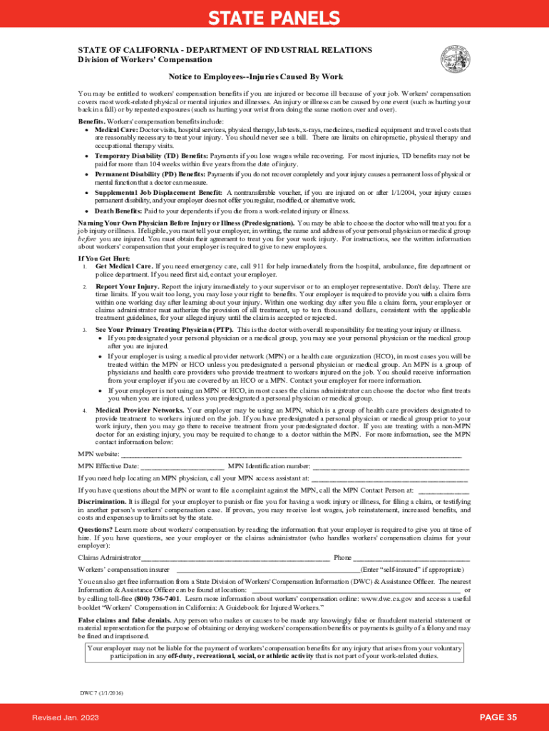 STATE PANELSPRINTCLEARSTATE OF CALIFORNIA DEPARTMENT OF INDUSTRIAL RELATIONS Division of Workers\' Compensation Notice to EmployeesInjuries Caused By Work You may be entitled to workers\' compensation