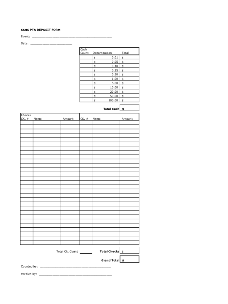 The sshs pta deposit form must include the depositor's name, contact information, date of deposit, amount deposited, and reason for the deposit.