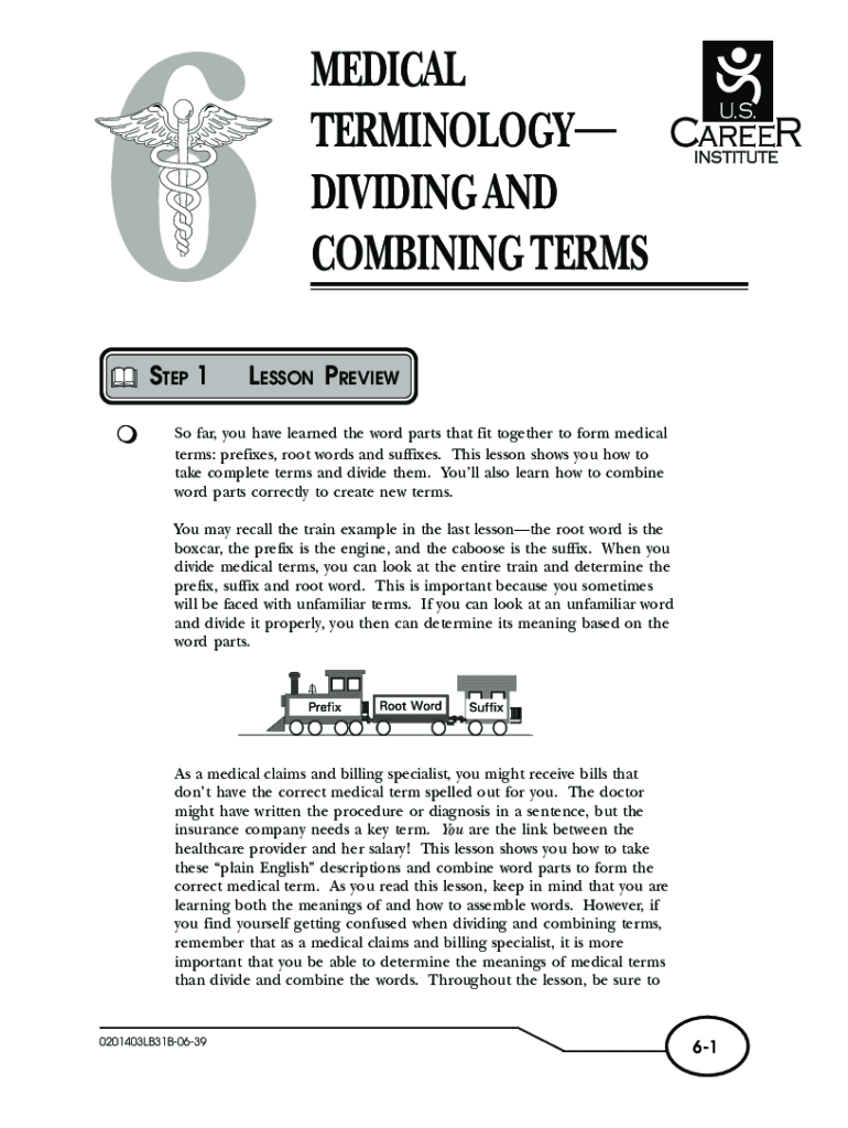 6 & STEP 1MEDICAL TERMINOLOGY DIVIDING AND COMBINING TERMSLESSON Previews far, you have learned the word parts that fit together to form medical terms: prefixes, root words and suffixes. This lesson