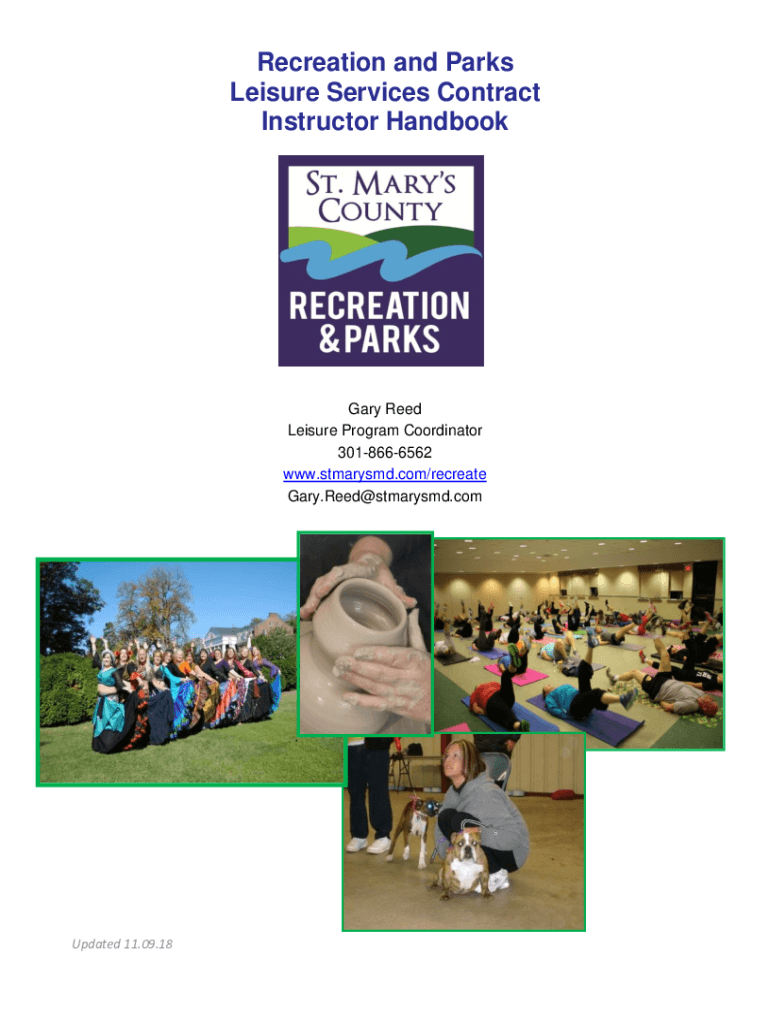 Recreation and Parks Leisure Services Contract Instructor Handbook Gary Reed Leisure Program Coordinator 3018666562 www.stmarysmd.com/recreate Gary.Reed@stmarysmd.com1 Updated 11.09.18Introduction