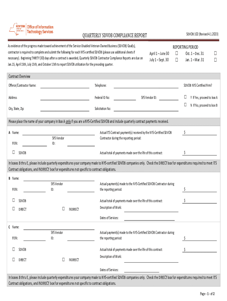 SD VOB 102 (Revised 4.1.2023)QUARTERLY SD VOB COMPLIANCE REPORT As evidence of the progress made toward achievement of the ServiceDisabled VeteranOwned Business (SD VOB) Goal(s), contractor is required
