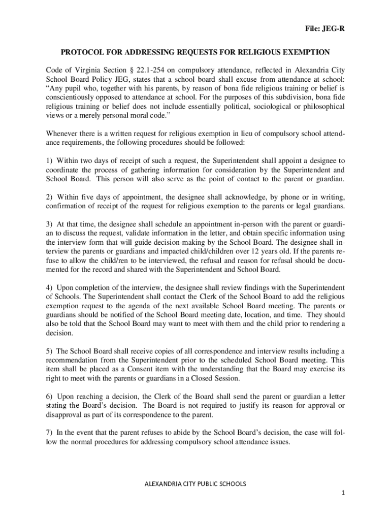File: JEER PROTOCOL FOR ADDRESSING REQUESTS FOR RELIGIOUS EXEMPTION Code of Virginia Section 22.1254 on compulsory attendance, reflected in Alexandria City School Board Policy LEG, states that a school