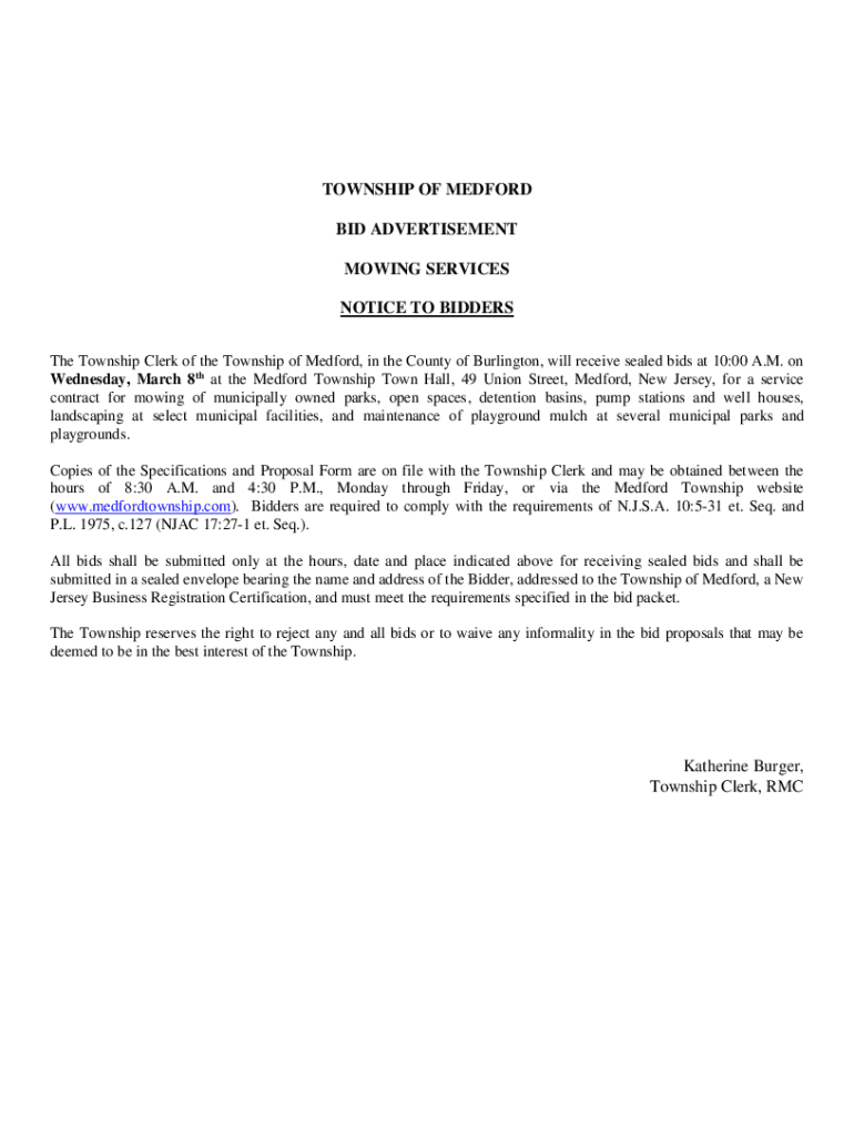 TOWNSHIP OF MEDFORD BID ADVERTISEMENT MOWING SERVICES NOTICE TO BIDDERS The Township Clerk of the Township of Medford, in the County of Burlington, will receive sealed bids at 10:00 A.M. on Wednesday,