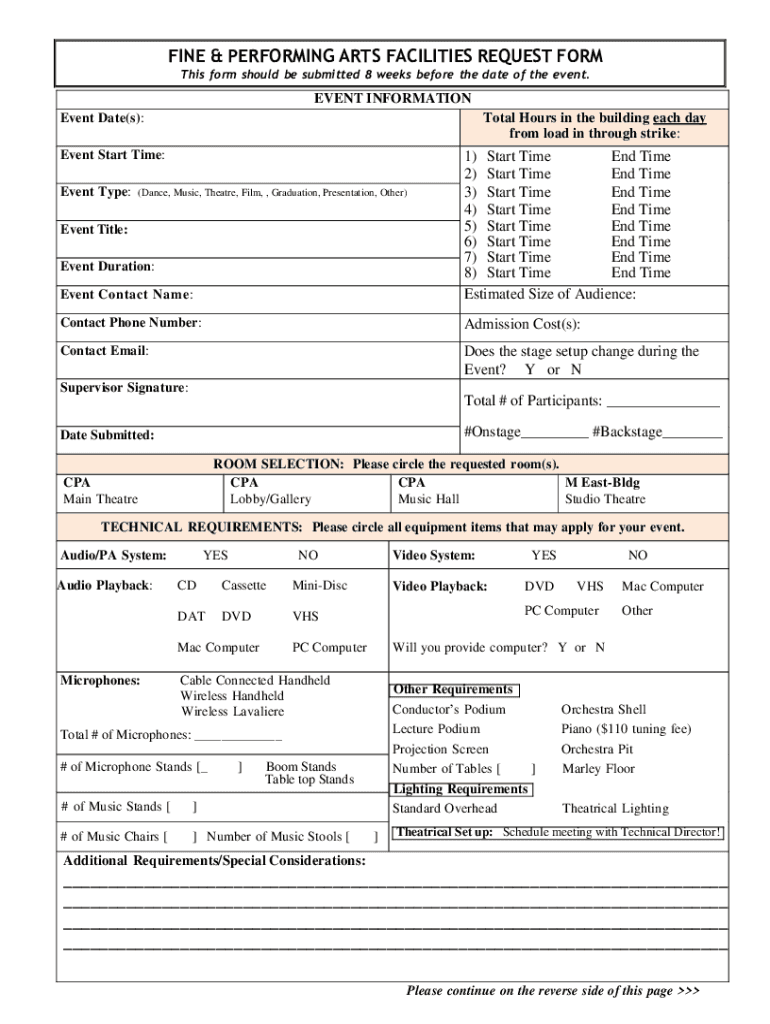 FINE & PERFORMING ARTS FACILITIES REQUEST FORM This form should be submitted 8 weeks before the date of the event. EVENT INFORMATION Total Hours in the building each day from load in through strike:Event