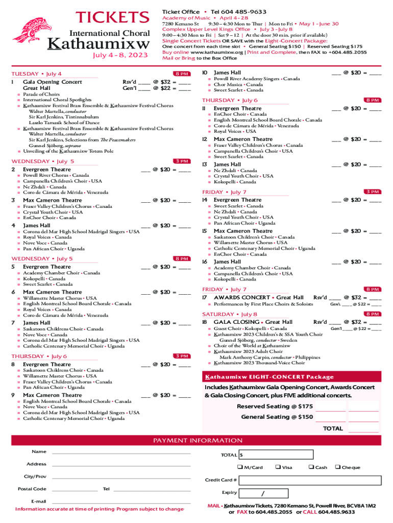 TICKETS International ChoralKathaumixw July 48, 2023Ticket Office Tel 604 4859633 Academy of Music April 4287280 Demand St9:004:30 Mon to Fri | Sat 912 | At the door 30 min. prior if available) Single