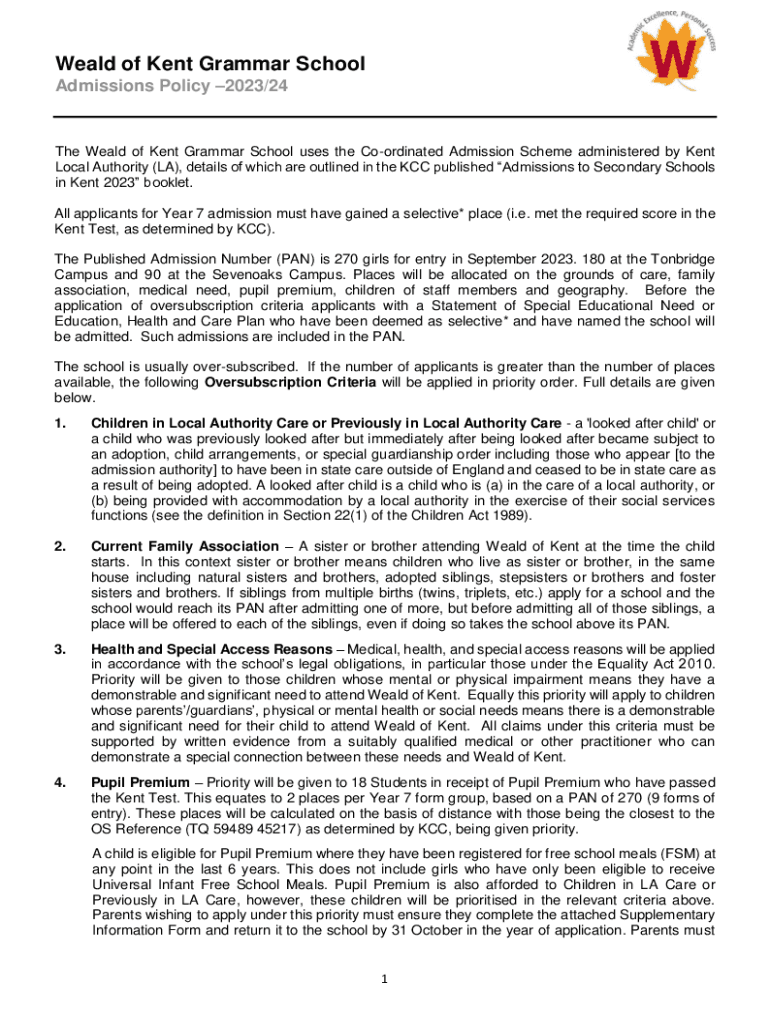 Weld of Kent Grammar School Admissions Policy 2023/24The Weld of Kent Grammar School uses the Coordinated Admission Scheme administered by Kent Local Authority (LA), details of which are outlined