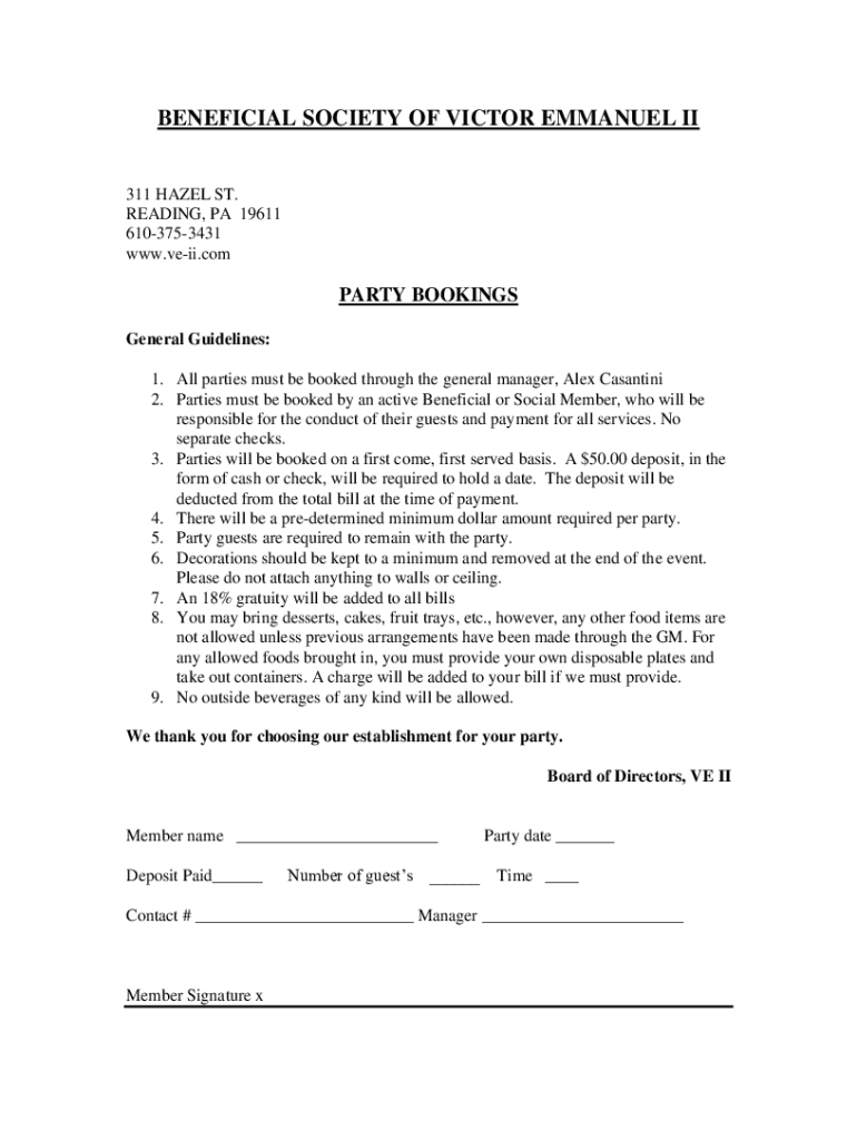 BENEFICIAL SOCIETY OF VICTOR EMMANUEL II 311 HAZEL ST. READING, PA 19611 6103753431 www.veii.comPARTY BOOKINGS General Guidelines: 1. All parties must be booked through the general manager, Alex Casting