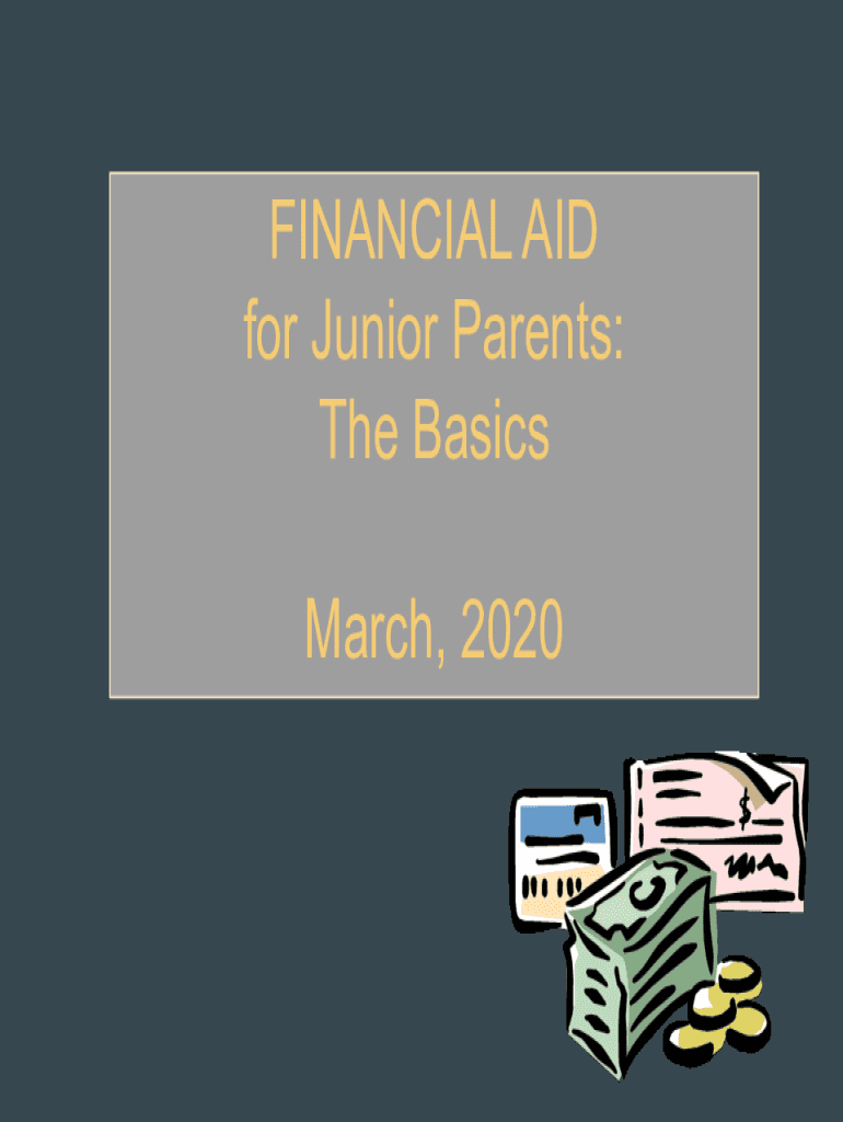 FINANCIAL AID for Junior Parents: The Basics March, 2020What you Need to Know by the End of This Evening! Financial Aid is not like Urban FA even though it seems like it. How do I figure out my EFC?