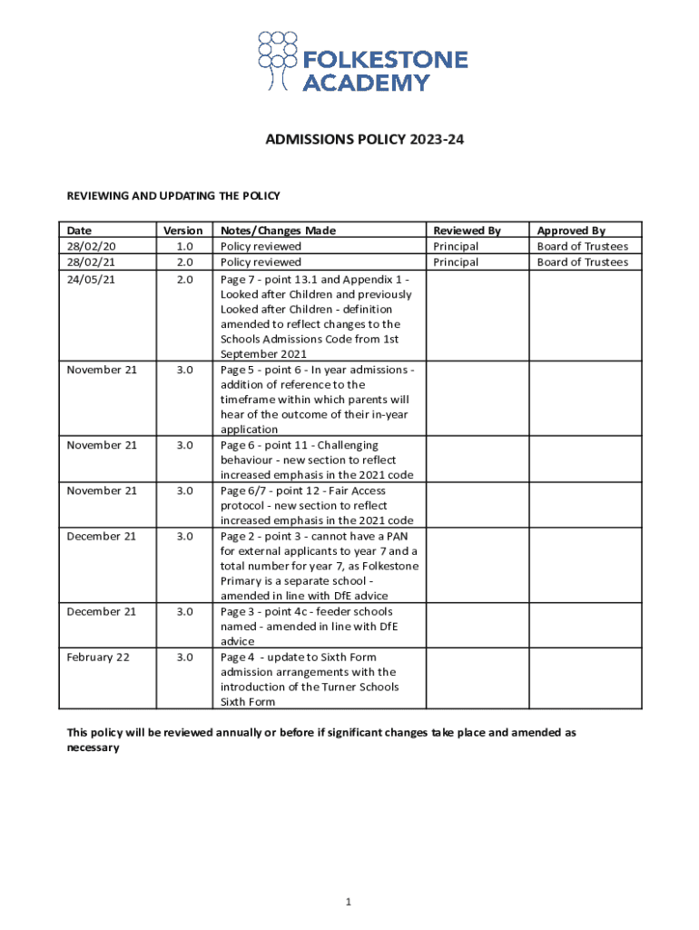 ADMISSIONS POLICY 202324REVIEWING AND UPDATING THE POLICY Date 28/02/20 28/02/21 24/05/21Version 1.0 2.0 2.0November 213.0November 213.0November 213.0December 213.0December 213.0February 223.0Notes/Changes