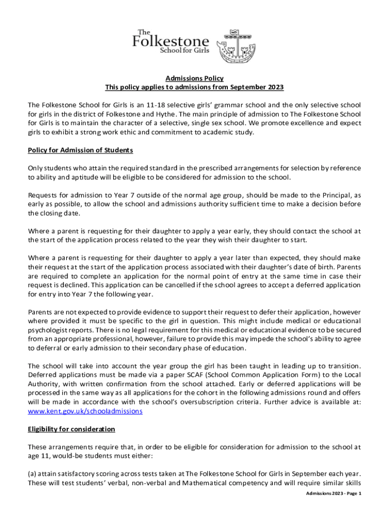 Admissions Policy This policy applies to admissions from September 2023 The Folkestone School for Girls is an 1118 selective girls grammar school and the only selective school for girls in the district