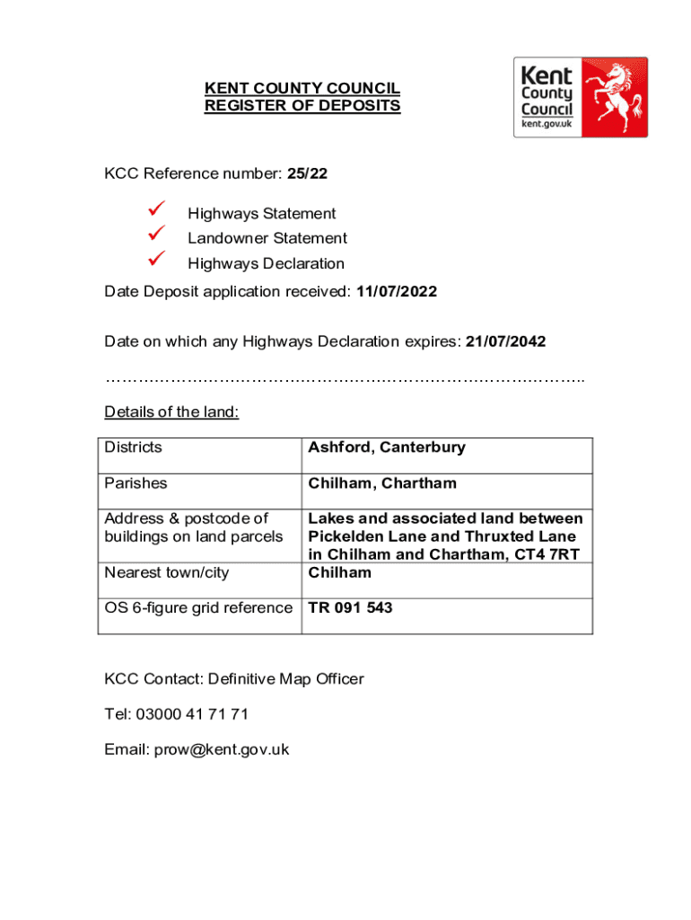 KENT COUNTY COUNCIL REGISTER OF DEPOSITS Reference number: 25/22 Highways Statement Landowner Statement Highways DeclarationDate Deposit application received: 11/07/2022 Date on which any Highways