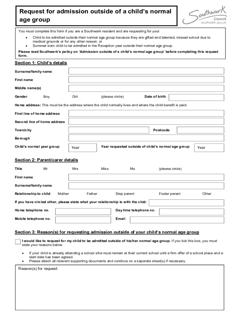 Request for admission outside a children normal age group You must complete this form if you are a Southward resident and are requesting for your: Child to be admitted outside their normal age group