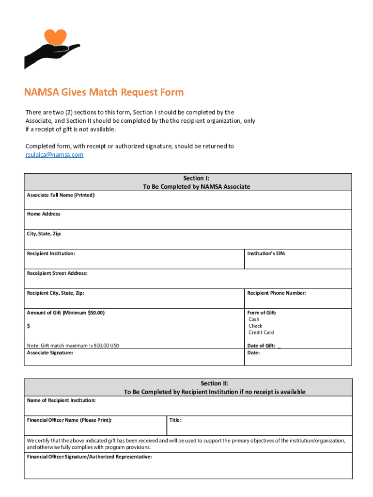 NASA Gives Match Request Form There are two (2) sections to this form, Section I should be completed by the Associate, and Section II should be completed by the recipient organization, only if a receipt