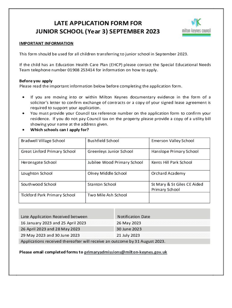 LATE APPLICATION FORM FOR JUNIOR SCHOOL (Year 3) SEPTEMBER 2023 IMPORTANT INFORMATION This form should be used for all children transferring to junior school in September 2023. If the child has an