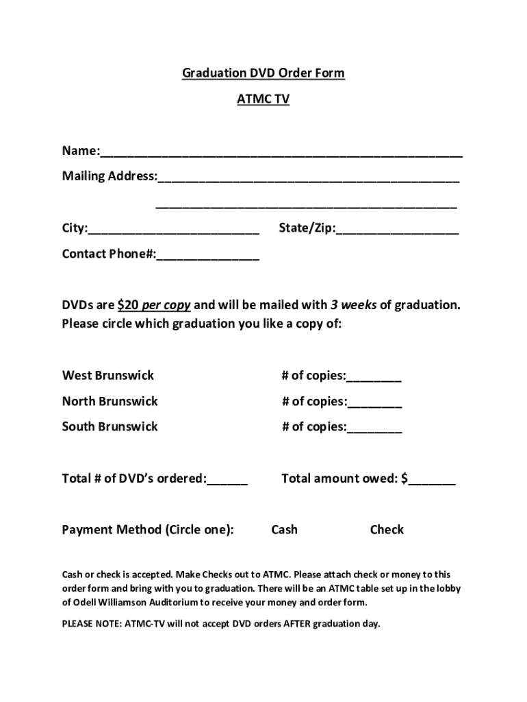 Graduation DVD Order Form ATC Name:___ Mailing Address:___ ___ City:___State/Zip:___Contact Phone#:___DVDs are $20 per copy and will be mailed with 3 weeks of graduation. Please circle which graduation
