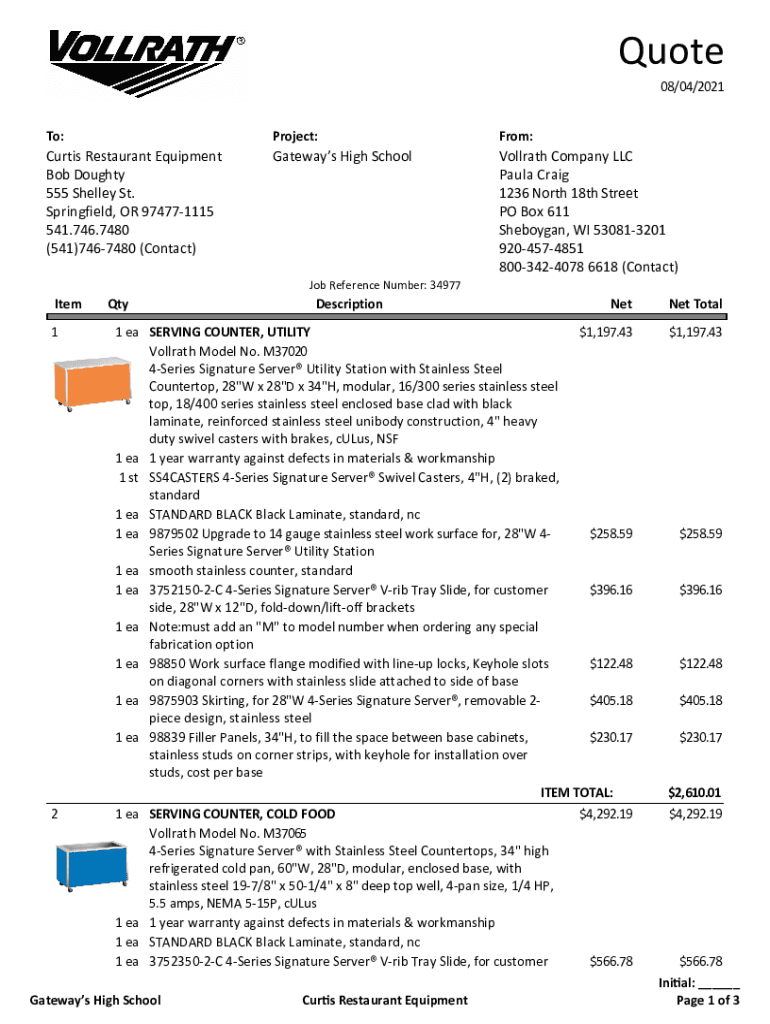 Quote 08/04/2021 To:Project:From:Curtis Restaurant Equipment Bob Doughty 555 Shelley St. Springfield, OR 974771115 541.746.7480 (541)7467480 (Contact)Gateways High SchoolVollrath Company LLC Paula