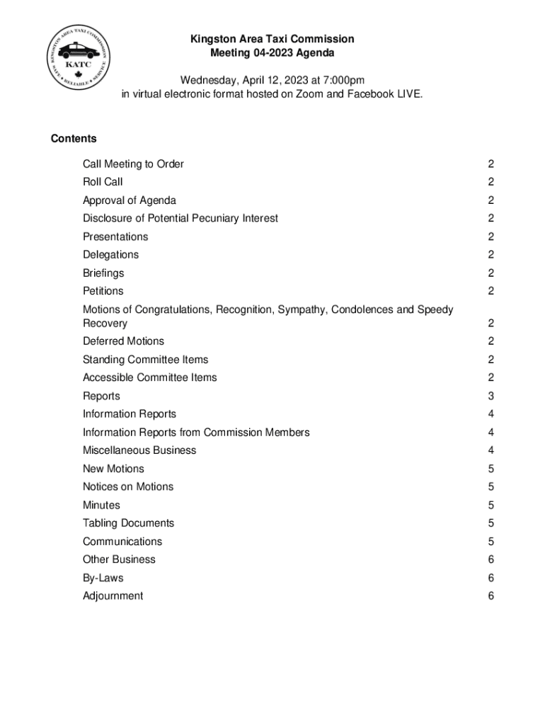 Kingston Area Taxi Commission Meeting 042023 Agenda Wednesday, April 12, 2023, at 7:000pm in virtual electronic format hosted on Zoom and Facebook LIVE. Contents Call Meeting to Order2Roll Call2Approval