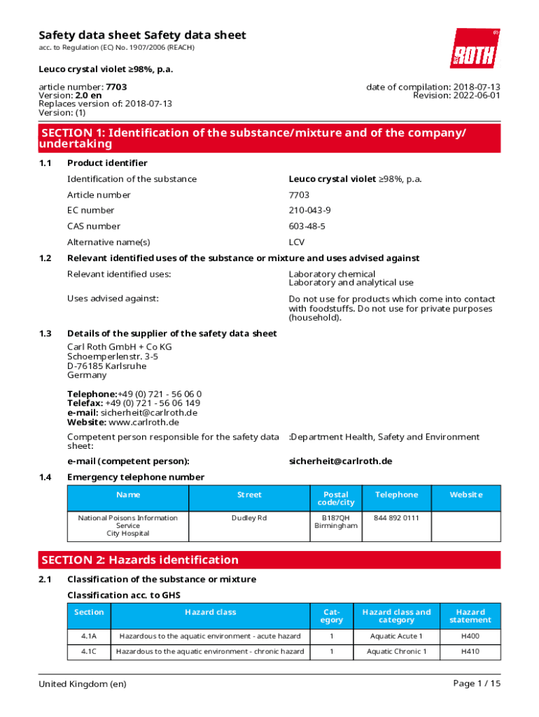 acc. to Regulation (EC) No. 1907/2006 (REACH)Luck crystal violet 98%, p.a.