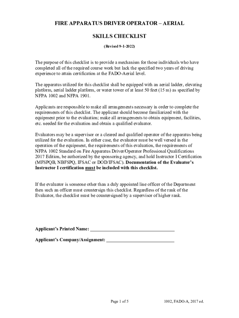 FIRE APPARATUS DRIVER OPERATOR AERIAL SKILLS CHECKLIST (Revised 912022)The purpose of this checklist is to provide a mechanism for those individuals who have completed all the required course work