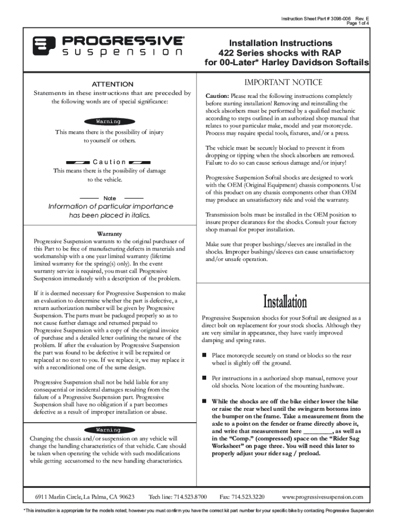 Instruction Sheet Part # 3098006 Rev. E Page 1 of 4Installation Instructions 422 Series shocks with RAP for 00Later* Harley-Davidson Softies ATTENTION Statements in these instructions that are preceded
