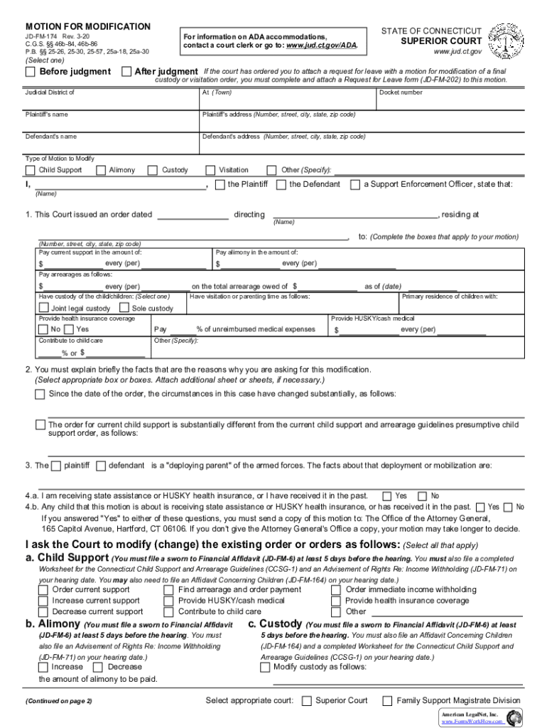 MOTION FOR MODIFICATION (Select one)Before judgmentSTATE OF Connecticut information on ADA accommodations, contact a court clerk or go to: www.jud.ct.gov/ADA.JDFM174 Rev. 320 C.G.S. 46b84, 46b86 P.B.