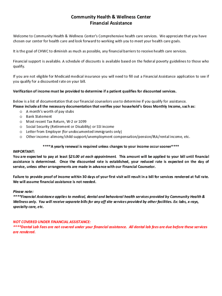 Community Health & Wellness Center Financial Assistance Welcome to Community Health & Wellness Centers Comprehensive health care services. We appreciate that you have chosen our center for health