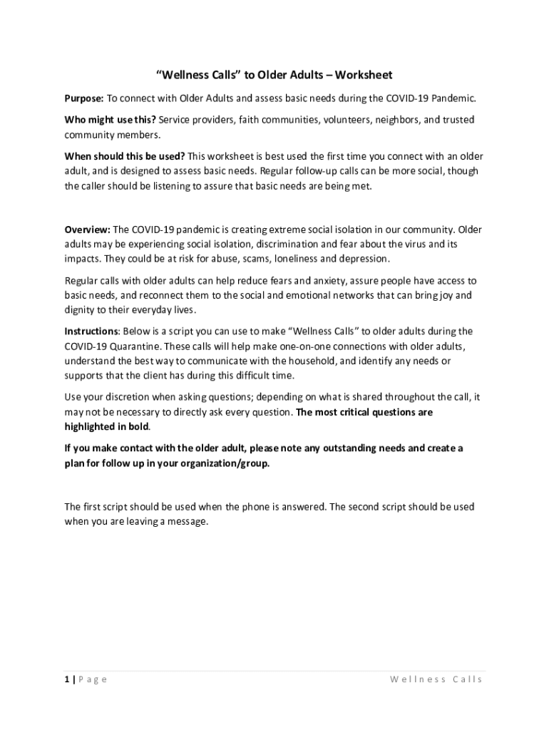 Wellness Calls to Older Adults WorksheetPurpose: To connect with Older Adults and assess basic needs during the COVID-19 Pandemic. Who might use this? Service providers, faith communities, volunteers,