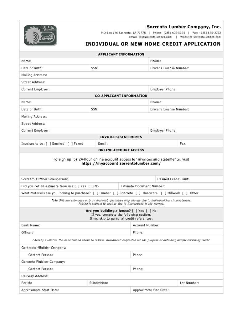 Sorrento Lumber Company, Inc. P. O Box 146 Sorrento, LA 70778 | Phone: (225) 6755375 | Fax: (225) 6752752 Email: ar@sorrentolumber.com | Website: sorrentolumber. Individual OR NEW HOME CREDIT APPLICATION