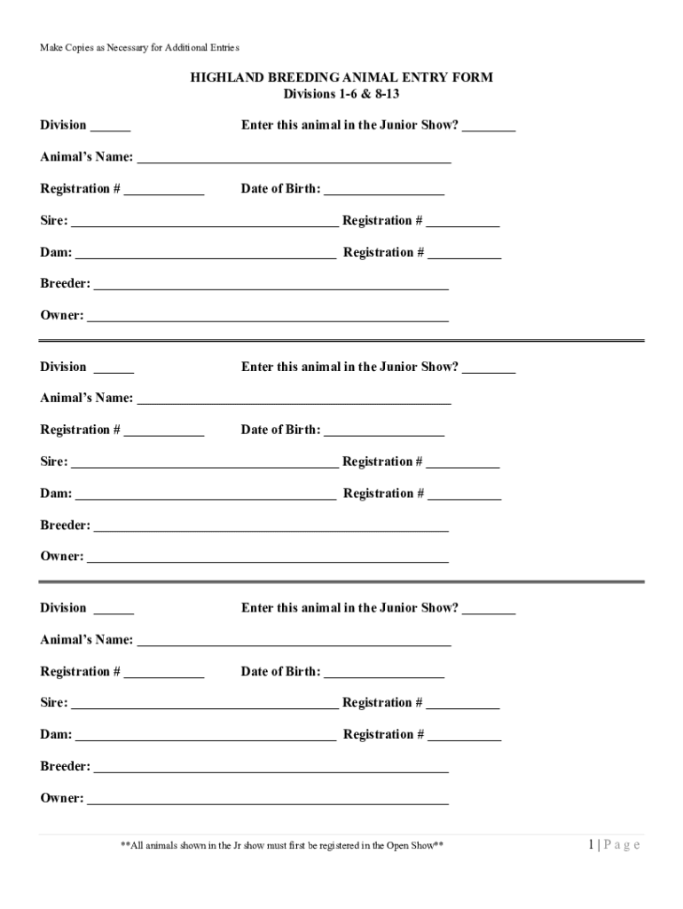 Make Copies as Necessary for Additional EntriesHIGHLAND BREEDING ANIMAL ENTRY FORM Divisions 16 & 813 Division ___Enter this animal in the Junior Show? ___Animals Name: ___ Registration # ___Date