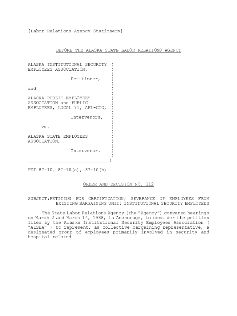 [Labor Relations Agency Stationery] BEFORE THE ALASKA STATE LABOR RELATIONS AGENCY ALASKA INSTITUTIONAL SECURITY EMPLOYEES ASSOCIATION, ) )) Petitioner,) ) and)) ALASKA PUBLIC EMPLOYEES) ASSOCIATION