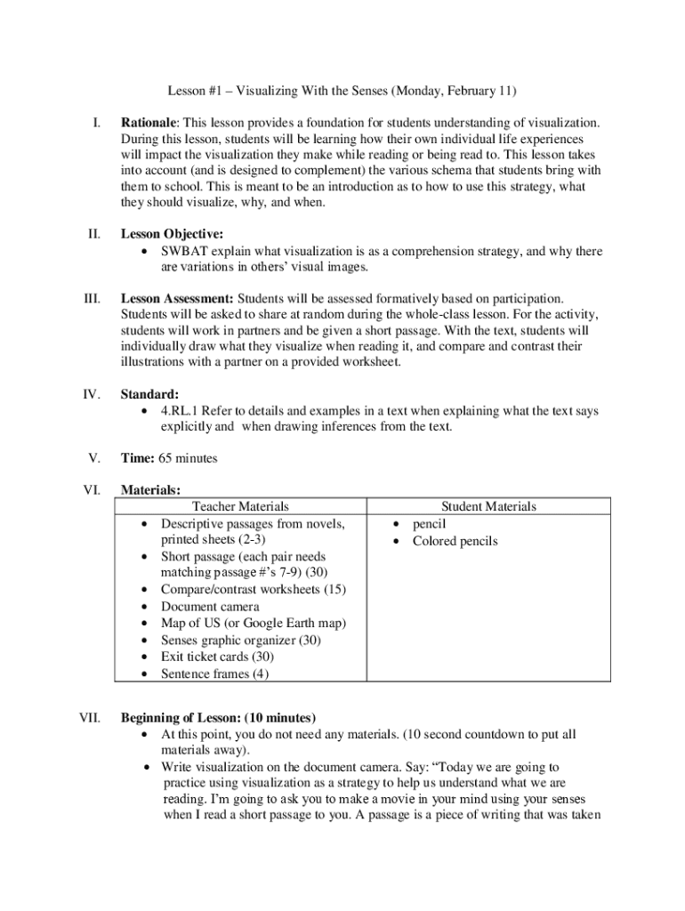 Lesson #1 Visualizing With the Senses (Monday, February 11) I. Rationale: This lesson provides a foundation for students understanding of visualization. During this lesson, students will be learning