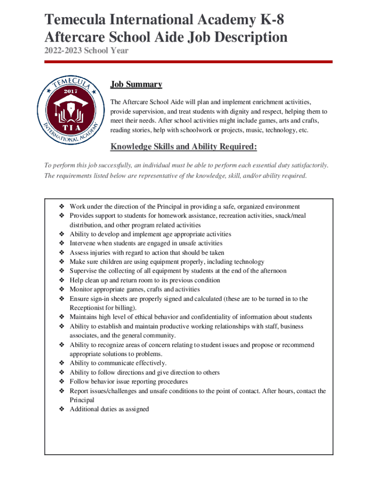 Temecula International Academy K8 Aftercare School Aide Job Description 20222023 School Year Job Summary The Aftercare School Aide will plan and implement enrichment activities, provide supervision,