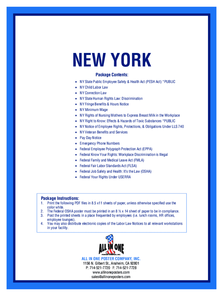 NEW YORK Package Contents: NY State Public Employee Safety & Health Act (PUSH Act) *PUBLIC NY Child Labor Law NY Correction Law NY State Human Rights Law: Discrimination NY Fringe Benefits & Hours