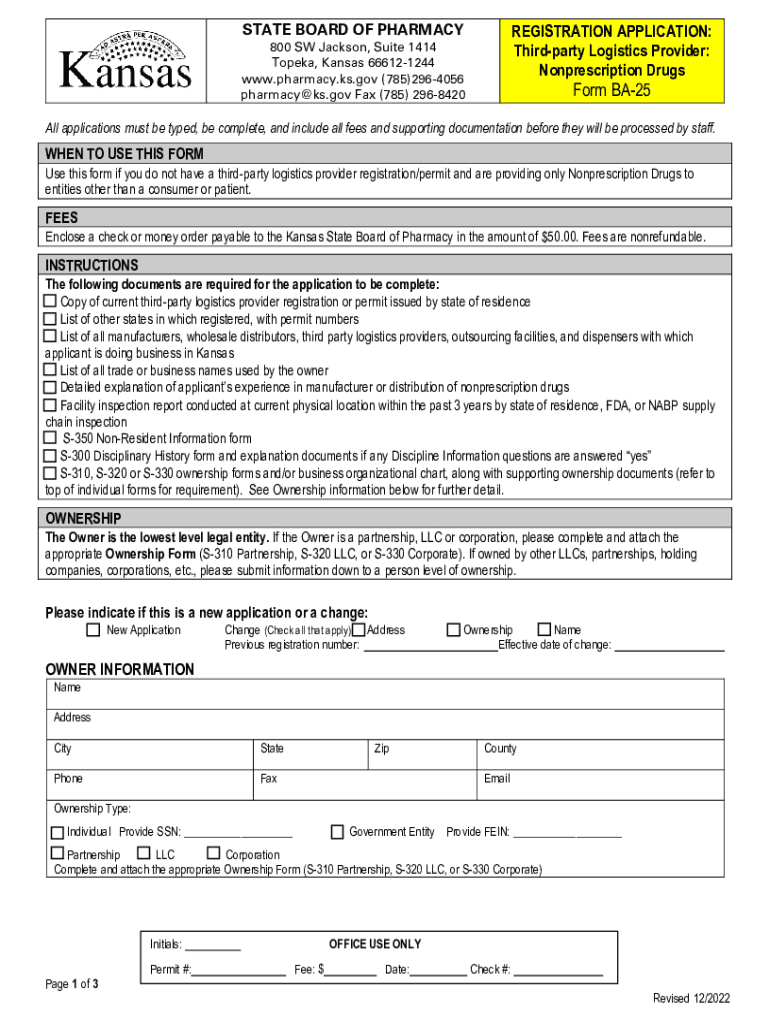 REGISTRATION APPLICATION: Third party Logistics Provider: Nonprescription Drugstore BOARD OF PHARMACY 800 SW Jackson, Suite 1414 Topeka, Kansas 666121244 www.pharmacy.ks.gov (785)2964056 pharmacy@ks.gov