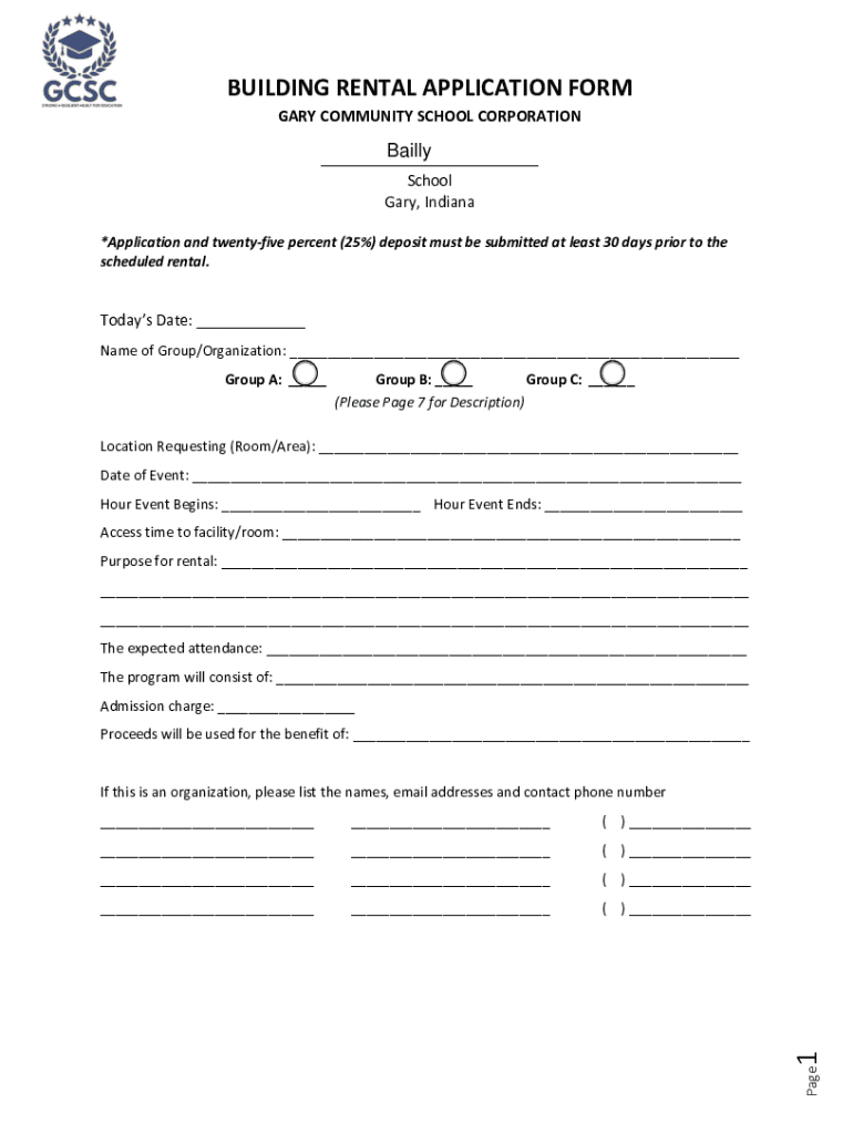 BUILDING RENTAL APPLICATION FORM GARY COMMUNITY SCHOOL CORPORATIONBailly ___ School Gary, Indiana *Application and twenty-five percent (25%) deposit must be submitted at least 30 days prior to the