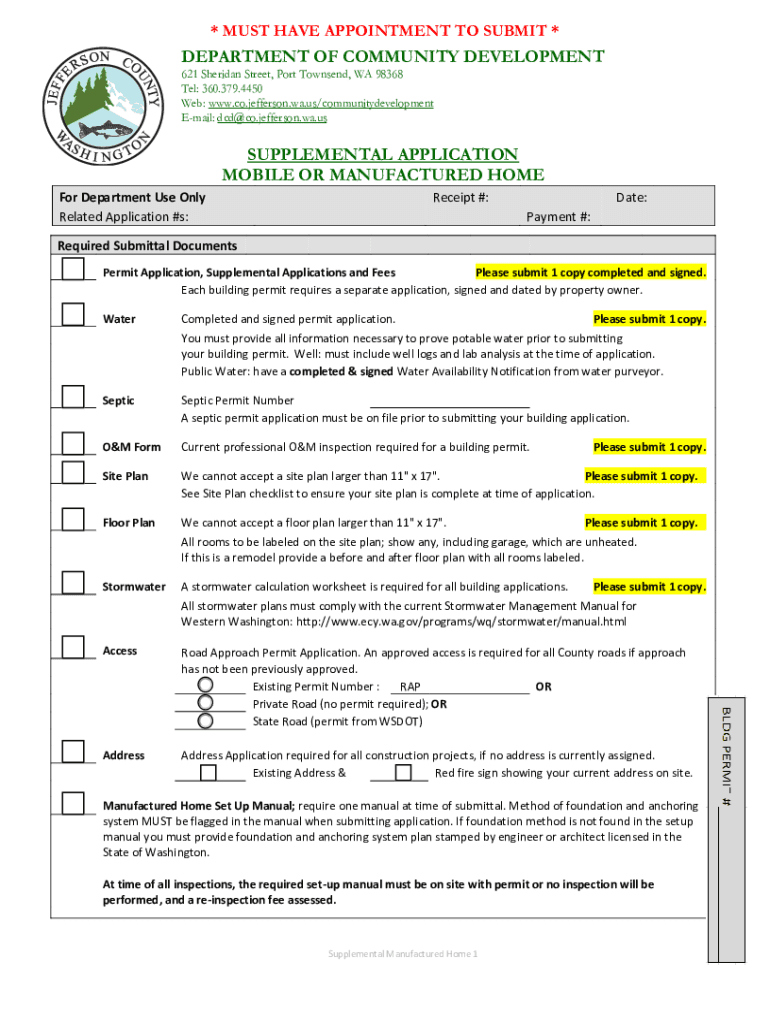 * MUST HAVE APPOINTMENT TO SUBMIT *DEPARTMENT OF COMMUNITY DEVELOPMENT621 Sheridan Street, Port Townsend, WA 98368 Tel: 360.379.4450 Web: www.co.jefferson.wa.us/communitydevelopment Email: dcd@co.jefferson.wa.usFor