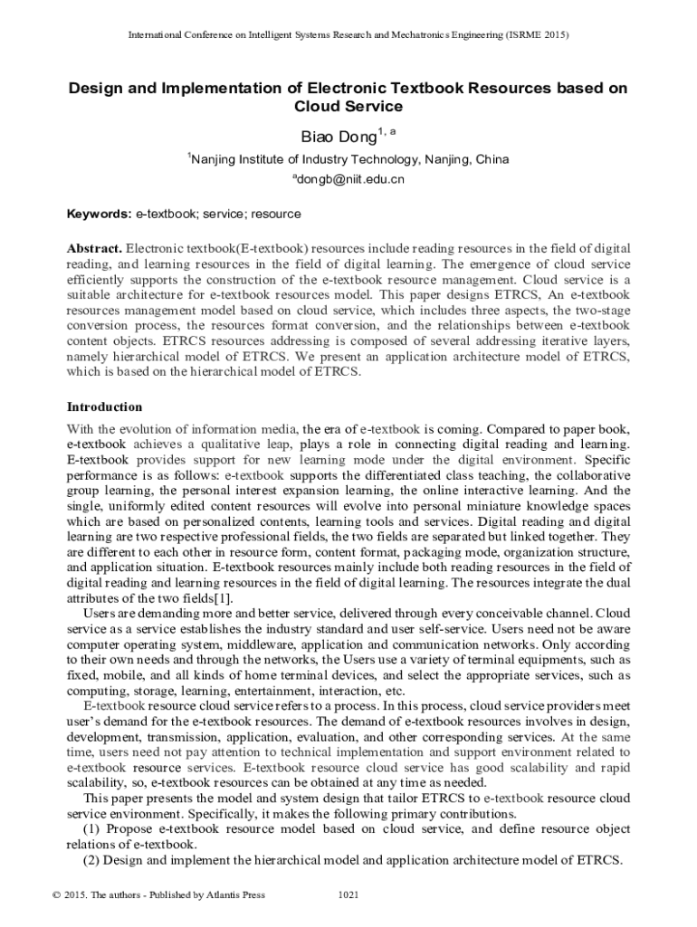 International Conference on Intelligent Systems Research and Mechatronics Engineering (ISME 2015)Design and Implementation of Electronic Textbook Resources based on Cloud Service Bias Dong1, a 1Nanjing