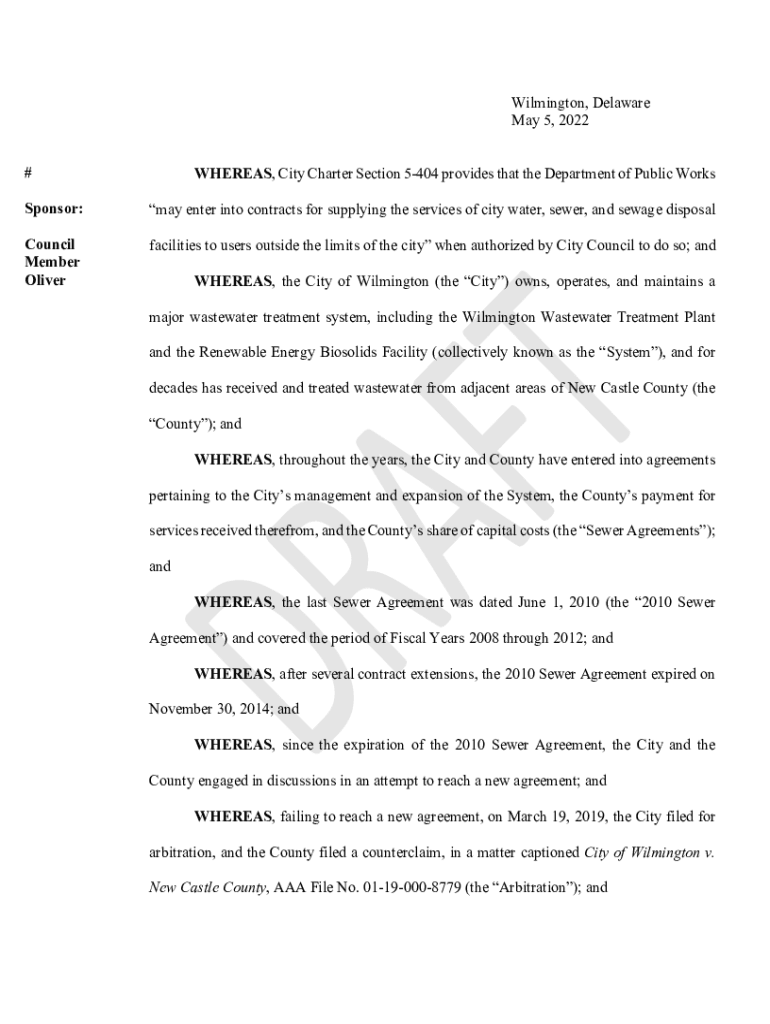 Wilmington, Delaware May 5, 2022 #WHEREAS, City Charter Section 5404 provides that the Department of Public WorksSponsor:may enter into contracts for supplying the services of city water, sewer, and