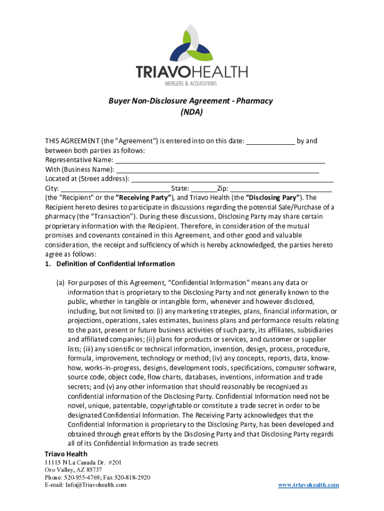 Buyer Nondisclosure Agreement Pharmacy (NDA) THIS AGREEMENT (the \” Agreement) is entered into on this date: ___ by and between both parties as follows: Representative Name: ___ With (Business Name):