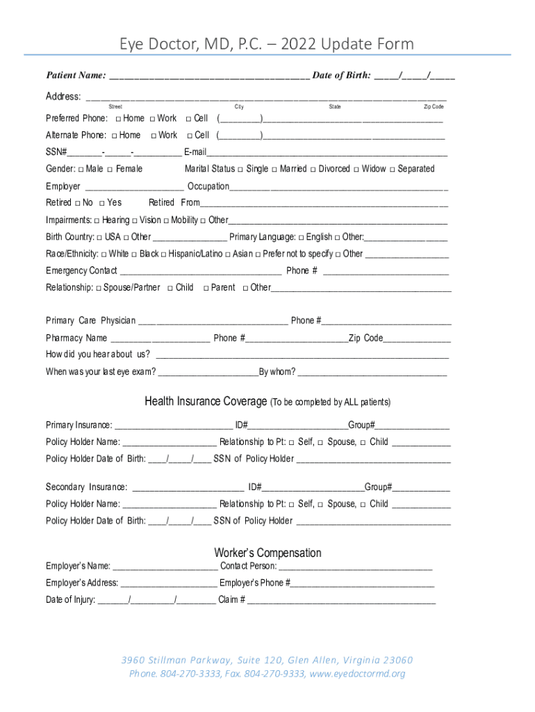 Eye Doctor, MD, P.C. 2022 Update Form Patient Name: ___ Date of Birth: ___/___/___Address: ___ StreetCityPreferred Phone: Homework CellStateZip Code(___)___Alternate Phone: Homework Cell (___)___