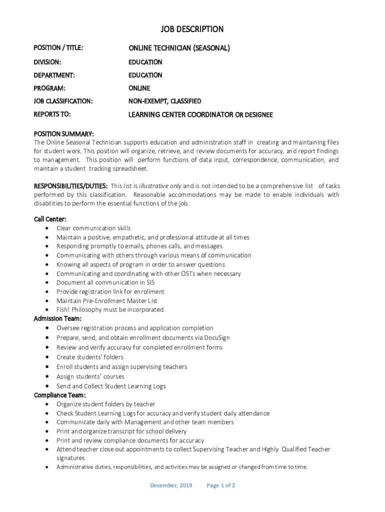 POSITION / TITLE:ONLINE TECHNICIAN (SEASONAL)DIVISION:EDUCATIONDEPARTMENT:EDUCATIONPROGRAM:ONLINE CLASSIFICATION:NONEXEMPT, CLASSIFIEDREPORTS TO:LEARNING CENTER COORDINATOR OR DESIGNEEPOSITION